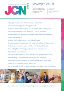 www.jcn.co.uk Leading, supporting and educating nurses in the community since 1972 Volume 34 Number 4 August/September 2020 The definitive peer-reviewed journal promoting excellence in caring for people at home Journal of Community Nursing SKIN CARE PRESCRIBING WOUND CARE CONTINENCE NUTRITION MENTAL HEALTH LEARNING ZONE Why optimising therapeutic compression is essential Community nursing stories during Covid-19 Prejudice of enforced lockdown and its impact on the older person Assessing continence issues during the Covid-19 pandemic Improving the lives of children/teenagers with continence challenges Sepsis: the essentials Leading chefs collaborate to combat food fatigue Improving wound care services with a just in time total purchase system Reflections on returning to the front line with the Covid-19 crisis New gelling fiber technology evolves exudate management Clinical skills: wound infection Development of the hybrid tissue viability nurse/lymphoedema nurse Implementing a new approach to pressure ulcer prevention Inappropriate use of diuretics and antibiotics for wet or ‘leaky’ legs Digital rectal examination: why, who, how? Caring for patients with Parkinson’s disease during the Covid-19 pandemic
